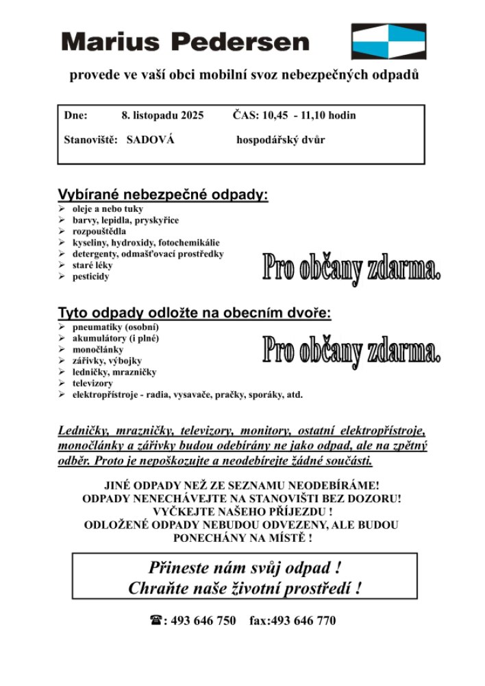 V sobotu 8.listopadu od 10:45 do 11:10 se uskuteční svoz nebezpečného odpadu.