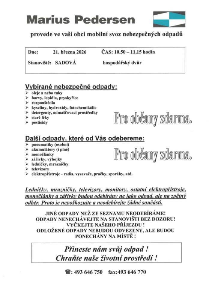 Svoz nebezpečného odpadu sobota 21.3.2026